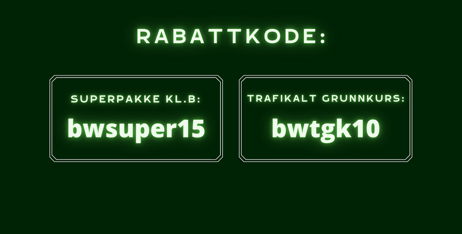 Legg inn rabattkoden, "bwsuper15" for Superpakka kl.B og "bwtgk10" for trafikalt grunnkurs, i rabattkodefeltet og vent til prisen oppdaterer seg.